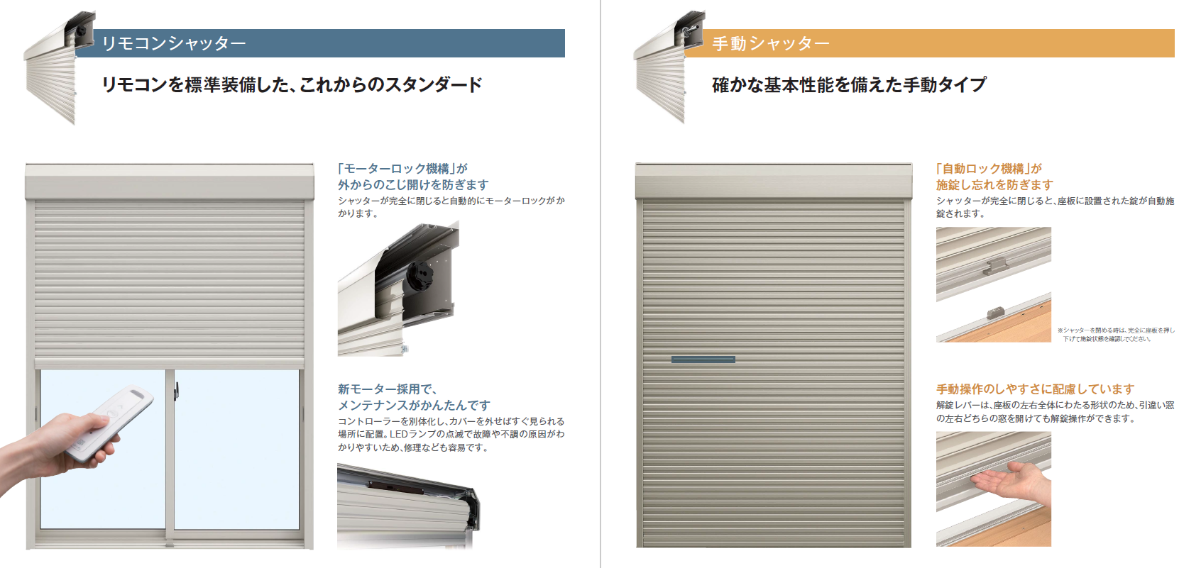 例えば、手動シャッターの開け閉めが毎日大変といった方には、リモコンシャッターを選んでいただくと