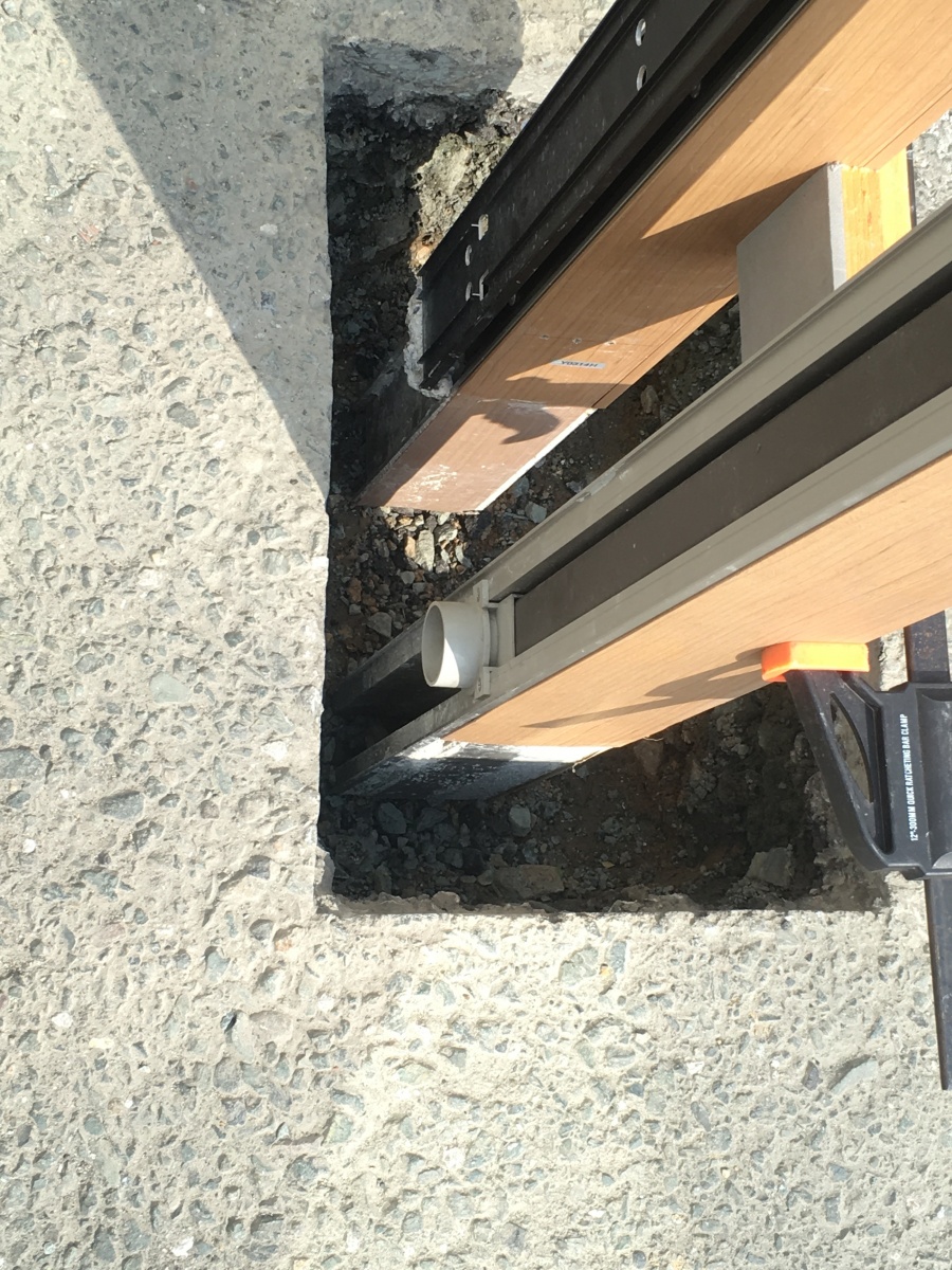 まず、テラス屋根の柱の部分を埋めるために、コンクリートに四角く穴をあけます。