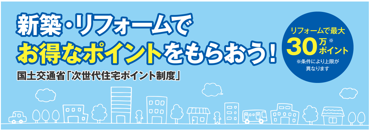 「環境」「安全・安心」「健康長寿・高齢者対応」「子育て支援・働き方改革」に役立てるために、住宅のリフォーム・新築を対象に商品等と交換できるポイントが発行されます