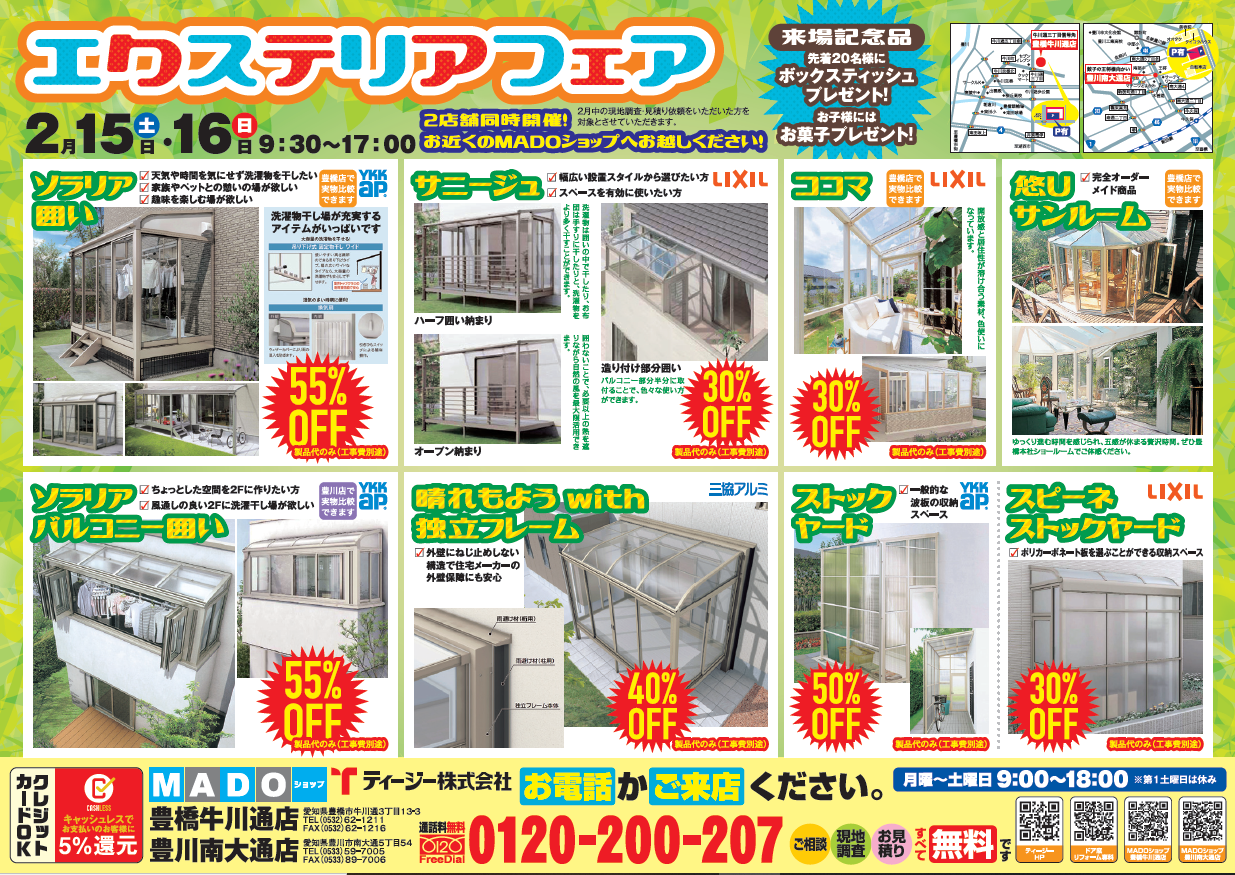 MADO豊橋牛川通店(ティージー株式会社 本社)にはテラス囲い(1F用)MADOショップ豊川南大通店にはバルコニー囲い(2F用)がそれぞれ展示されています