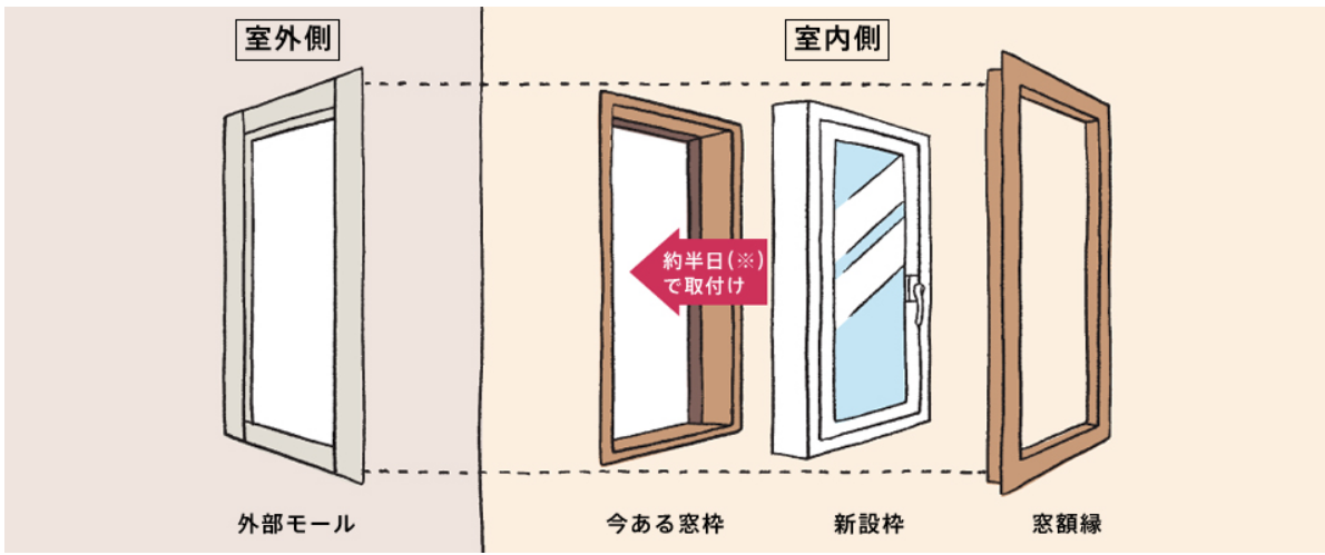 壁を壊さず施工するため、通常の窓取替に比べると、時間的負担、金額的な負担も少なく、部屋の気温が保ちやすい窓になります