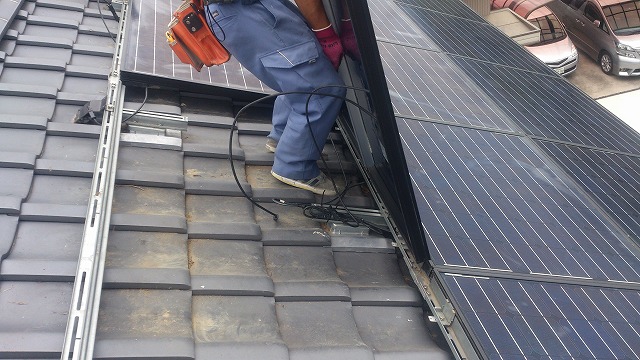 本日は豊橋市の太陽光発電システムを設置して3年目のお宅で瓦屋根と太陽光パネルの隙間をかくす鳥被害対策をしました。