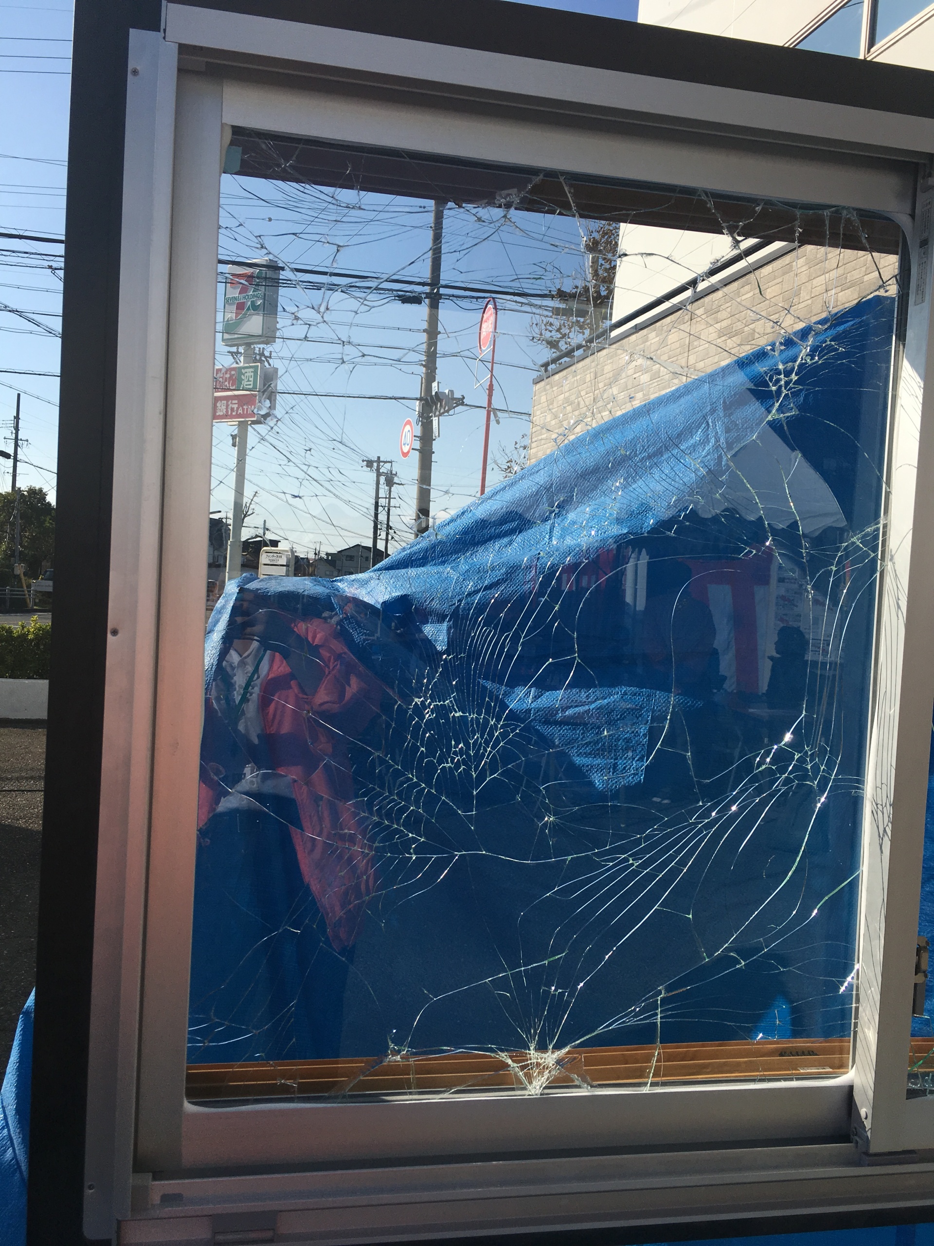 実際に飛散防止フィルムが貼ってあるガラスを割りました。