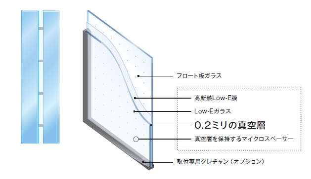 2枚のガラスの間にある0.2ミリの真空層とLow-Eガラスによって