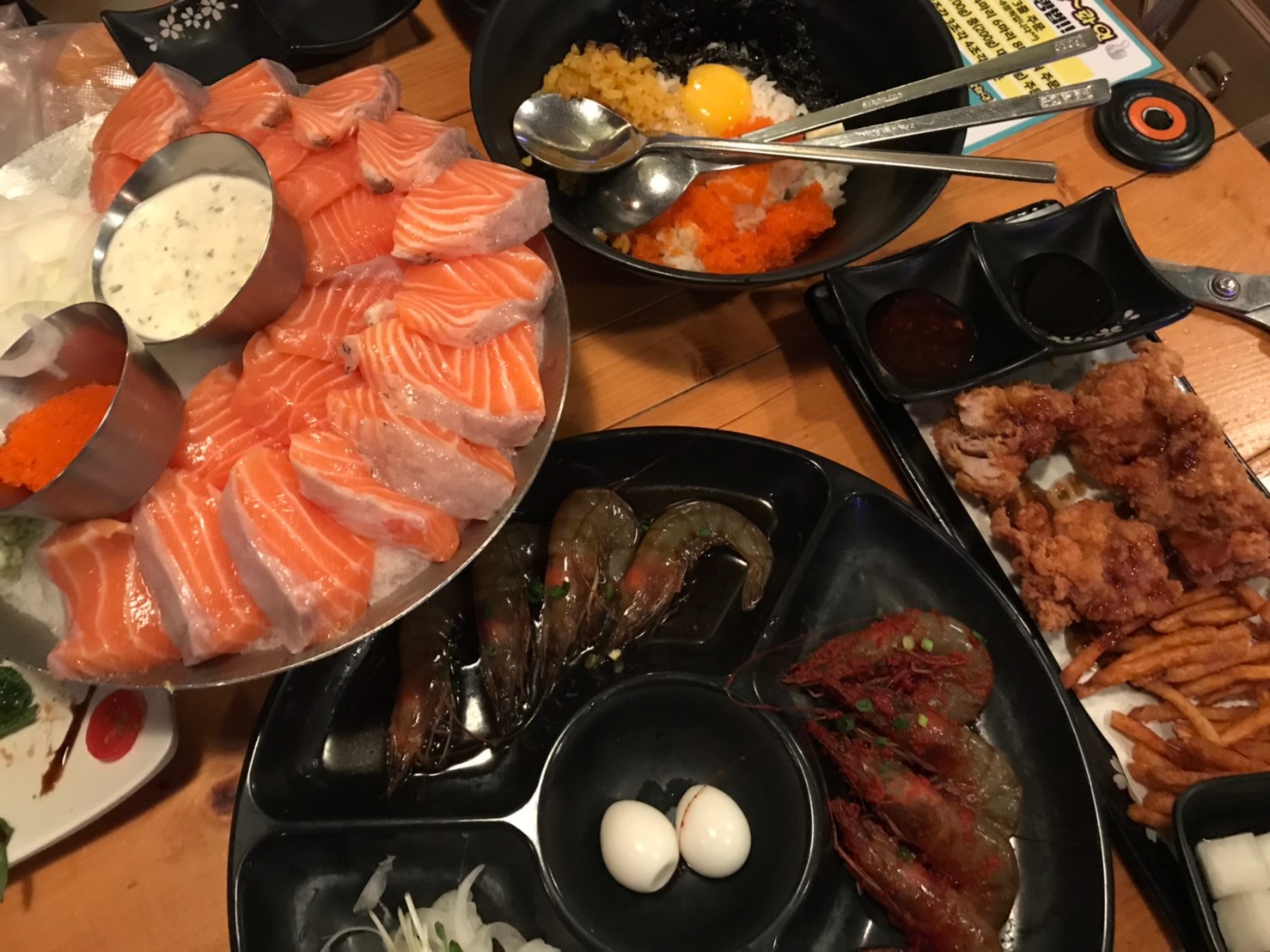 このお店はサーモンのお刺身とカンジャンセウ(エビの醤油漬け)