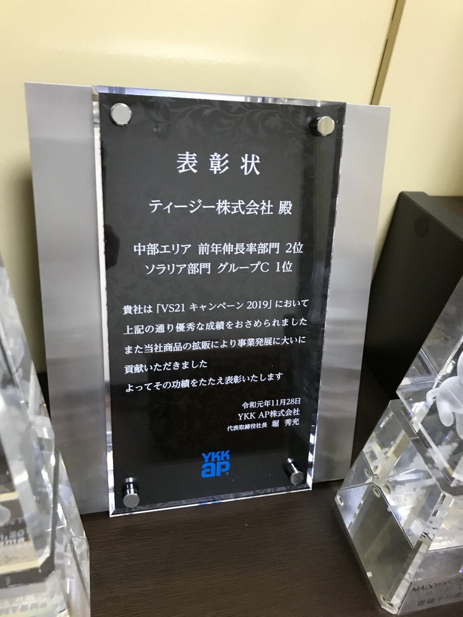 昨年の11月末のことですが、YKKAPさんから栄誉ある賞を頂きました