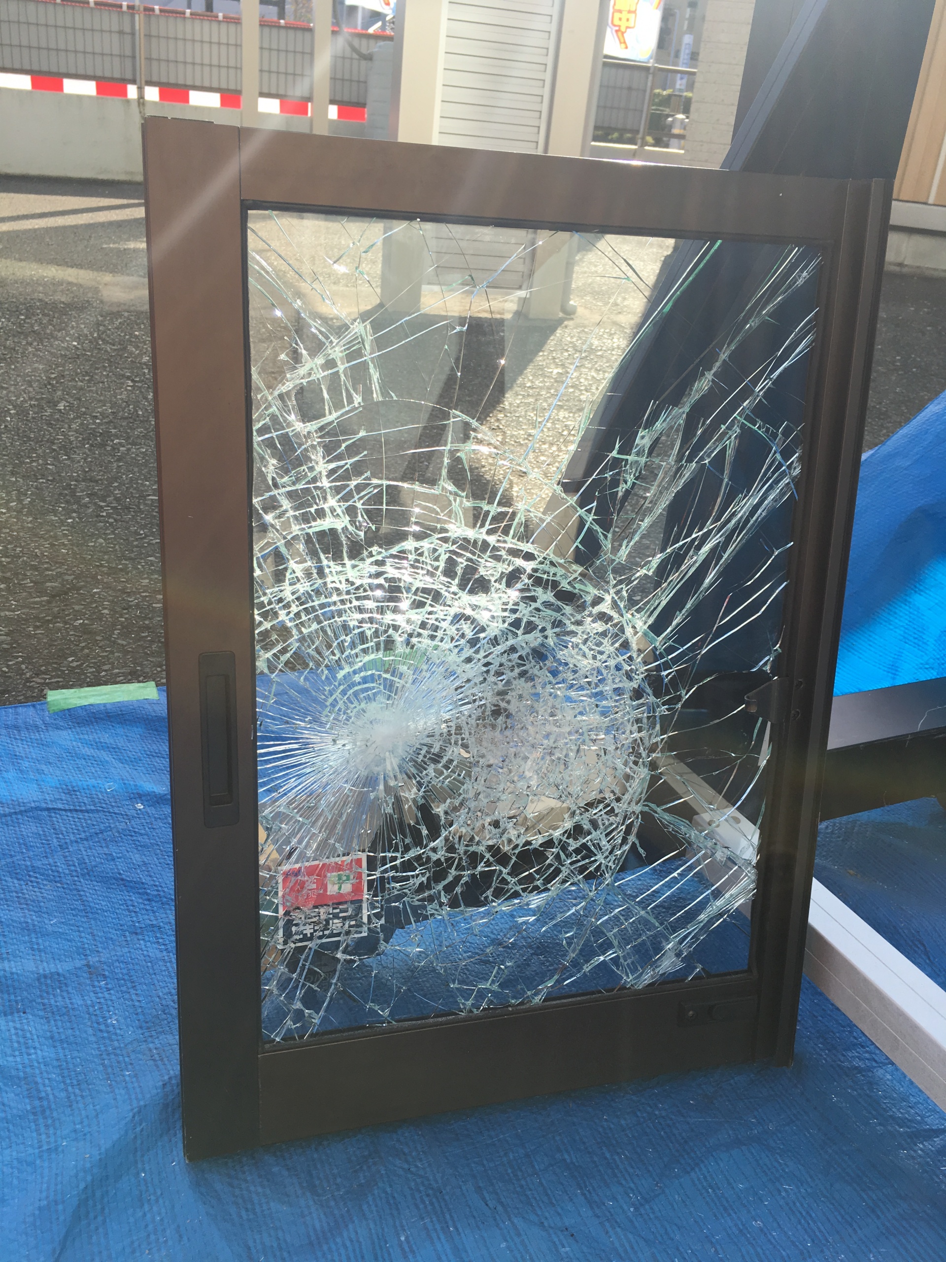 ガラスが飛び散らずに、枠にびたっとくっついているのが防犯ガラスの良い所なんです