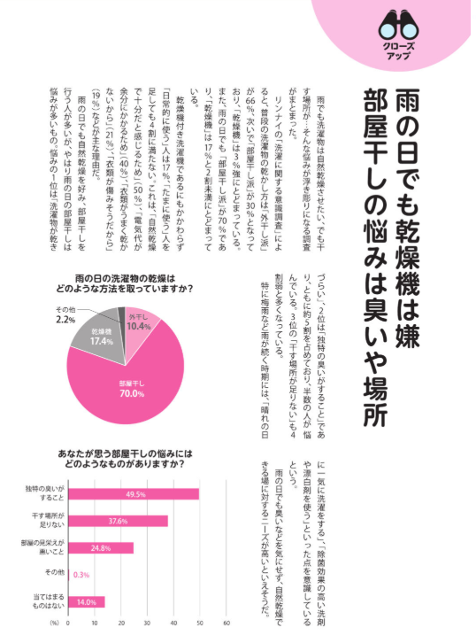 今回は、お家のダウンサイジングや部屋干し、トレンドとなっている所有し大切に使う(楽しく精神的に満たされながら物を持つ)といった記事が載っております