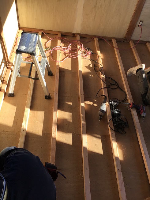 その上に床材(フローリング材)を張っていきます。