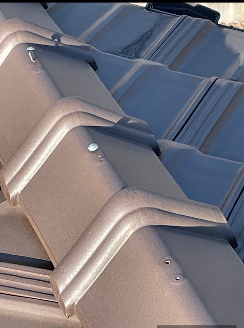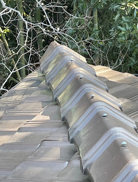 寄棟屋根の軒先に近い方の冠瓦の釘が抜けていて瓦がずれて冠瓦が浮き上がっているのを確認しました。