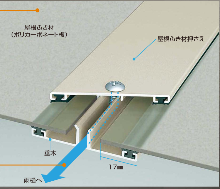 屋根ふき材押さえの強度を調整することにより、ポリカーボネート板の温度上昇で生じる伸縮による、歪みを抑えられます!