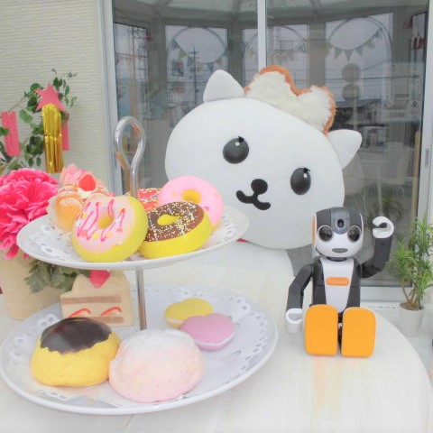 ケーキにマカロン、ドーナッツに菓子パンと眺めるだけでもワクワクするお菓子が並び、ロボホンは得意の歌や早口言葉を披露し、皆と楽しんでいます。