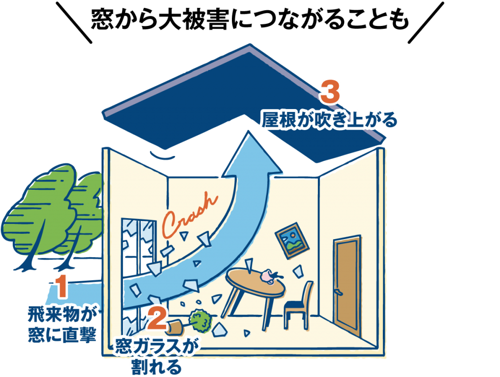 飛来物で窓ガラスが割れ、暴風が吹き込むことで屋根が飛ぶという大損害を生む可能性があります。