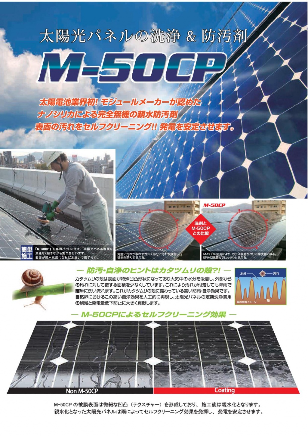 一度コーティングをすると親水膜がつくられ太陽光パネルの定期的な洗浄費用の削減と発電量低下防止にも大きく貢献します。
