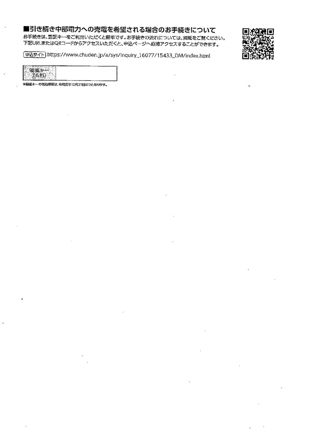 売電単価48円満了後にあらたな買取契約を中部電力へ希望する方はQRコードを読み取ってもらって記載してある認証キー6桁の英数字を入力することで中部電力の買取プランの申込が可能です。