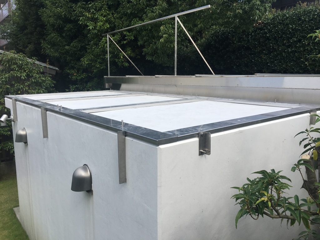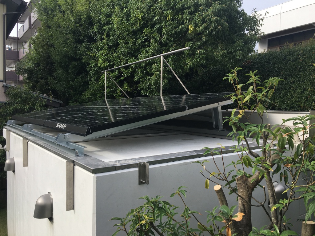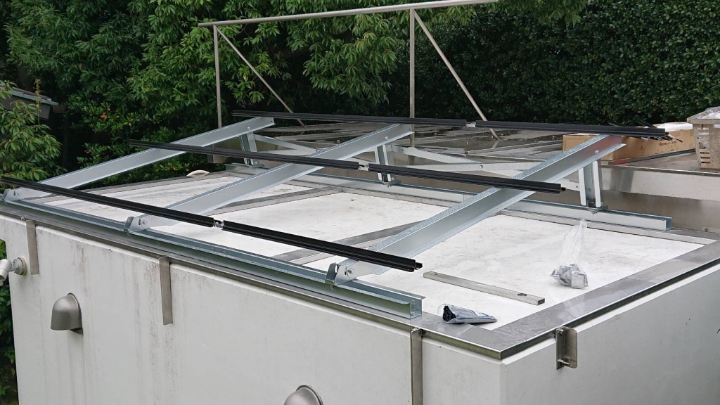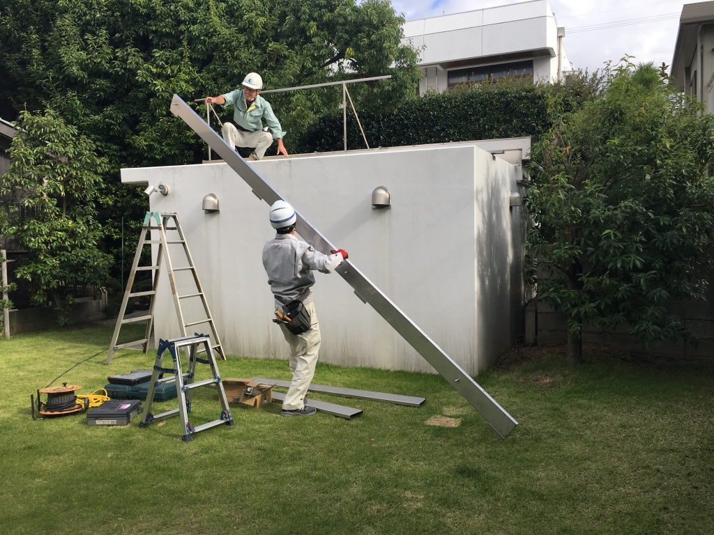 お客様のご要望で穴をあけずに設置をしたいということからステンレスで土台をつくってその上に架台を組んで設置することになりました。