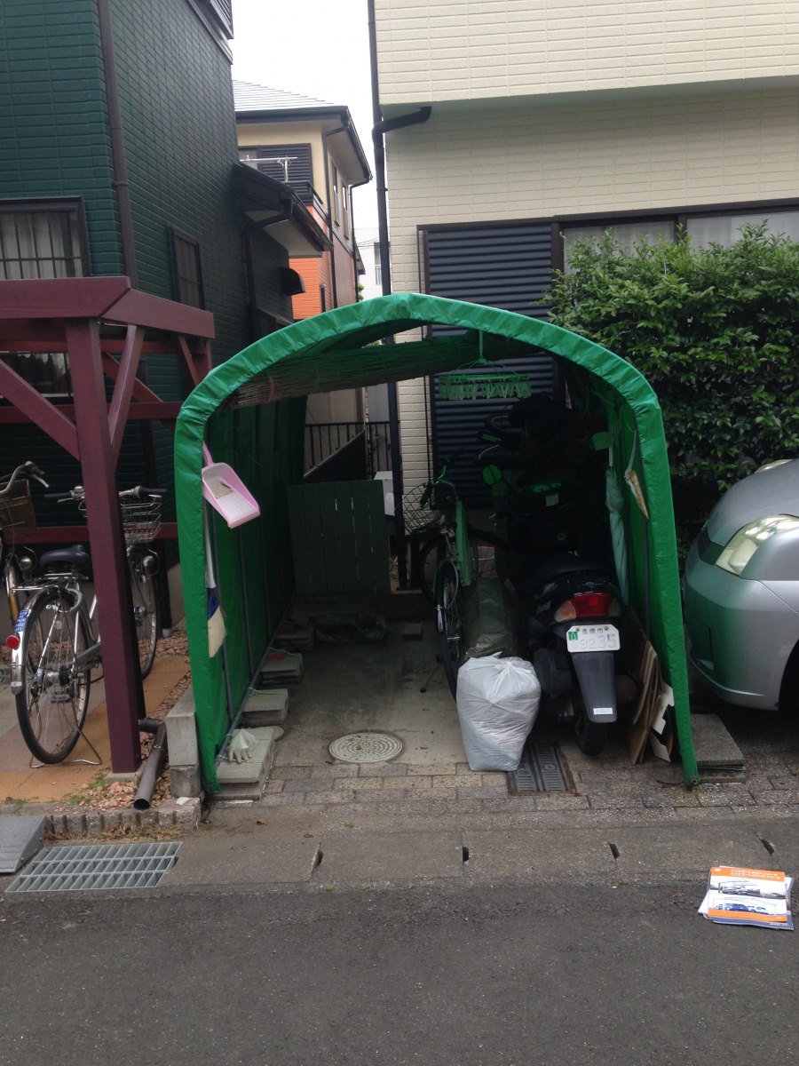 もともとビニール製のものが覆いかぶさっていて、自転車と原付を雨から守っていました。