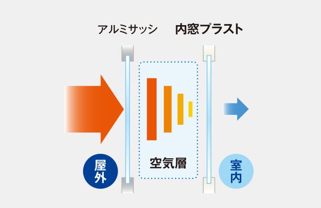 屋外からの音は、窓ガラスを通り抜けて入ってきます。アルミサッシと内窓の間の空気層は音に対して吸音材の役割を果たし、窓間が離れているほど遮音性が高くなります。広い空気層を確保することで、通過する音を抑制。幅広い周波数の音を効率よく減らします。