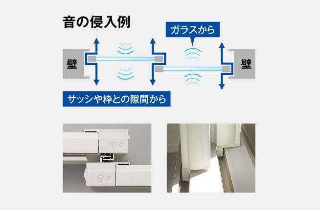 部屋に設けられた窓は、住宅の中で圧倒的に壁厚が薄い場所。人が不快に感じる騒音の多くは、その窓ガラスを通って侵入しています。また、アルミサッシのわずかなすき間からも外の音や内の音が出入りします