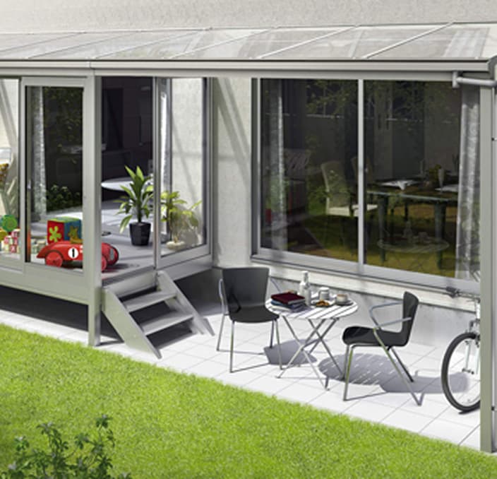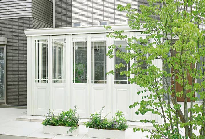 テラス囲いタイプは、テラス屋根商品に前面ユニットと側面ユニットを装備し、ガラス窓や出入り口ドアを取り付けられるようにした簡易の雨よけ・風よけの商品です。正面部分と側面部分は用途や施工場所に応じて選ぶことができ、現場対応能力に優れたタイプです。コストパフォーマンスに優れているため、広く一般的に選ばれていますが、断熱性能に欠けるため部屋としての使用は不向きです。