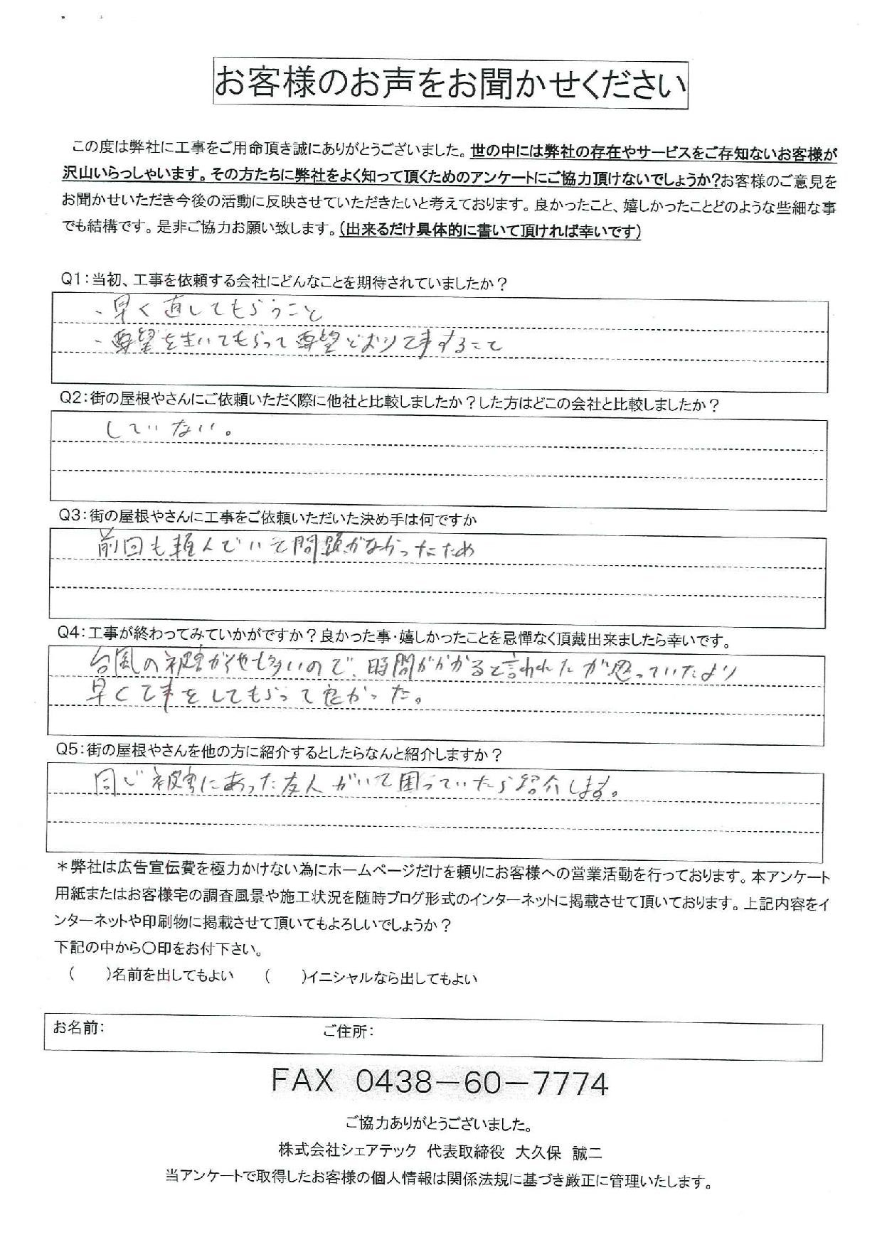 台風被害が他も多いので時間がかかると言われたが 思っていたより早く工事をしてもらって良かった。