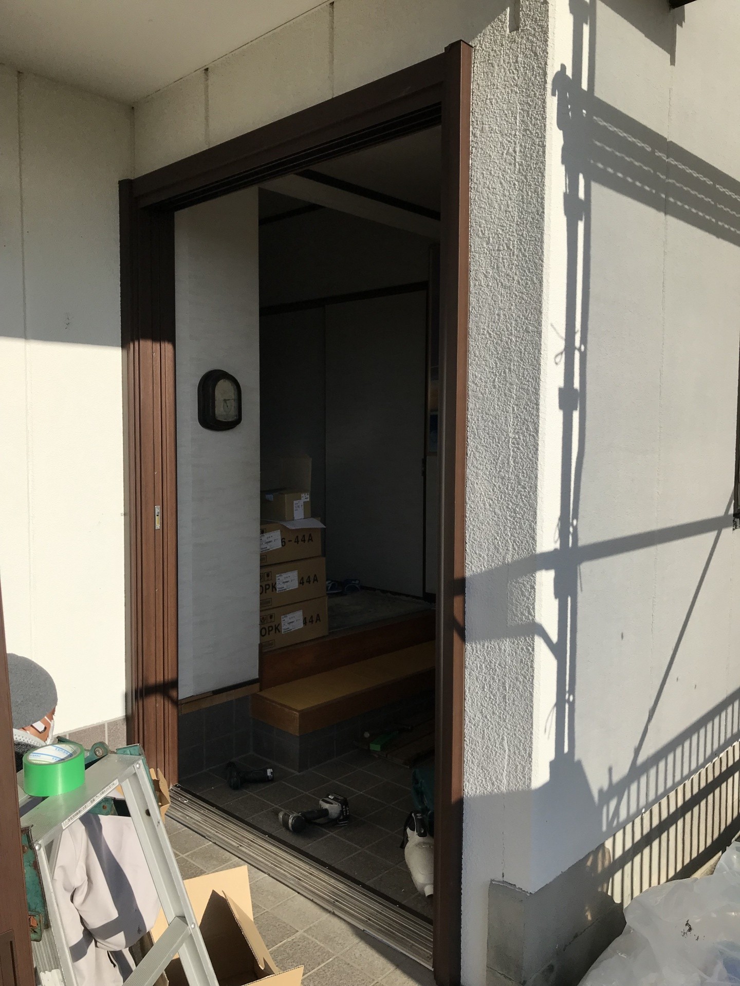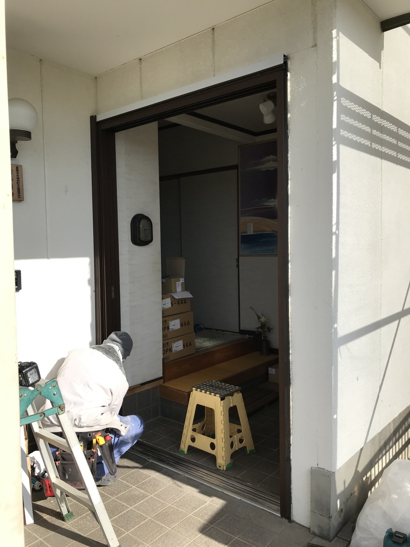 こちらは既存の引戸とランマ(引戸の上のガラスの部分)と、引戸とランマの間の無目を外し、新しい枠を取り付けている様子です。