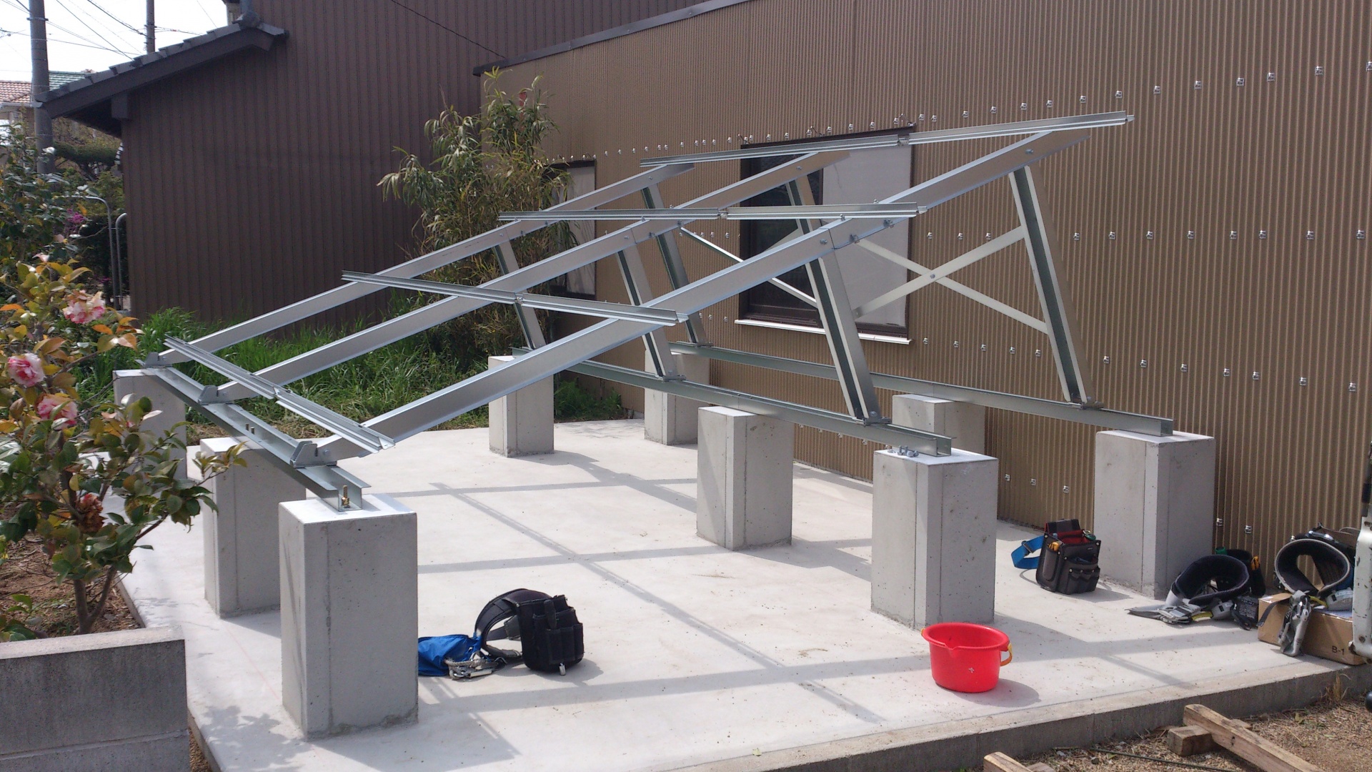今回太陽光発電システムを増設することになり、庭の空いたスペースを使用して設置しました。