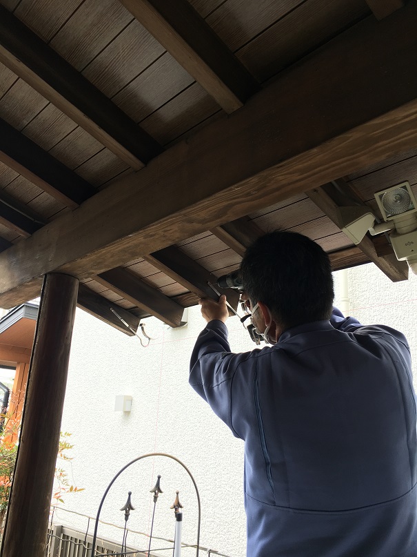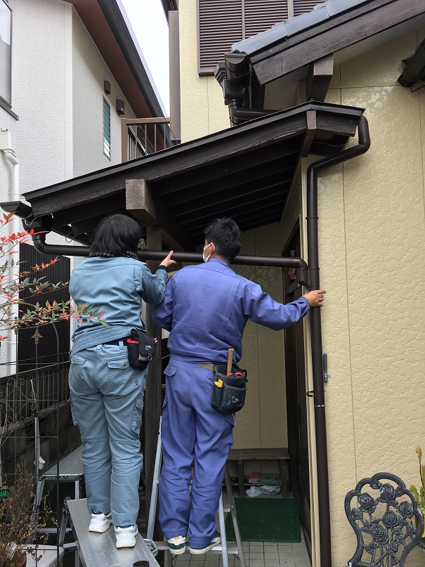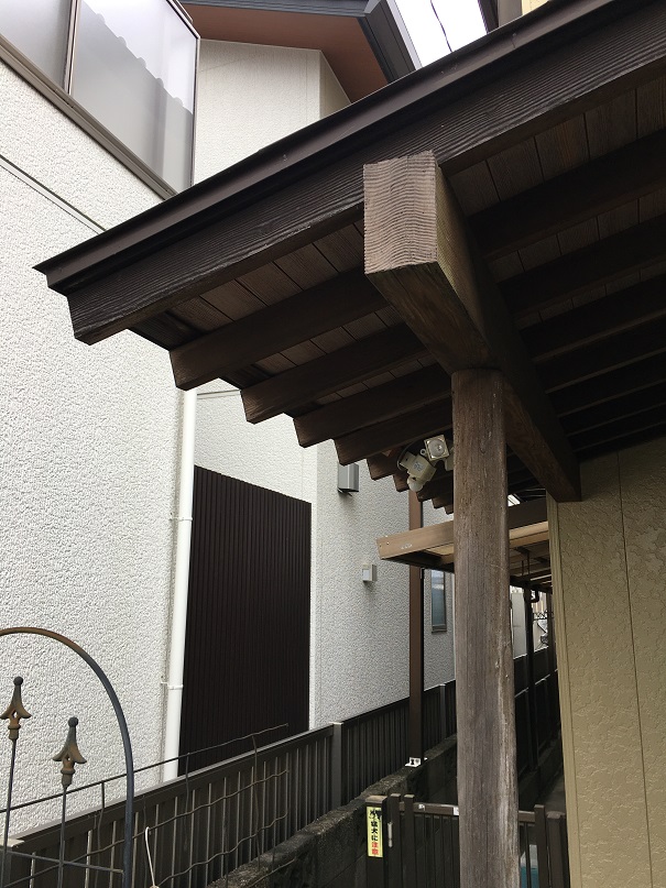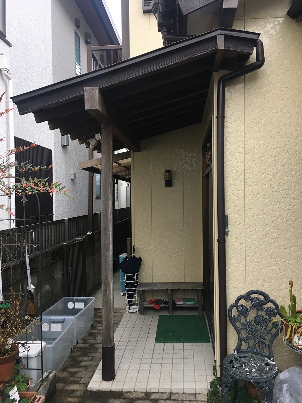 この状態ですと雨水がそのまま屋根から落ちて来て玄関が濡れたり、雨の強い日には滝のようになってしまいます。