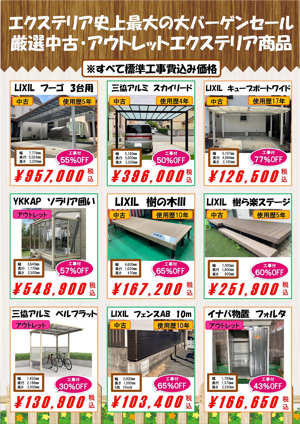厳選したエクステリアの優良中古品・アウトレット品を低価格で販売しています。